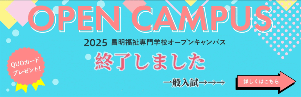 昌明福祉専門学校は、これからの社会福祉を担う人材を養成し、 国家資格(介護福祉士)を取得できる学校です。 メッセージ 先生はどんな人?介護福祉士という職業を選んだきっかけや、先生の想いを聞きました! 詳しくはこちら 実習先の昌明福祉会で働く先輩に、座談会形式でお話を伺いました。リアルなトークは必見です! 詳しくはこちら 各種情報 「人間と社会」「介護」「こころとからだのしくみ」「医療的ケア」の4領域を学びます。 詳しくはこちら 自己法人以外にも50以上の施設と提携。あなたに合った就職先をサポートします。国家試験対策も充実! 詳しくはこちら 募集要項と、授業料や修学資金貸付制度についてご案内しています。 詳しくはこちら 学校・授業について 詳しくはこちら 詳しくはこちら 詳しくはこちら